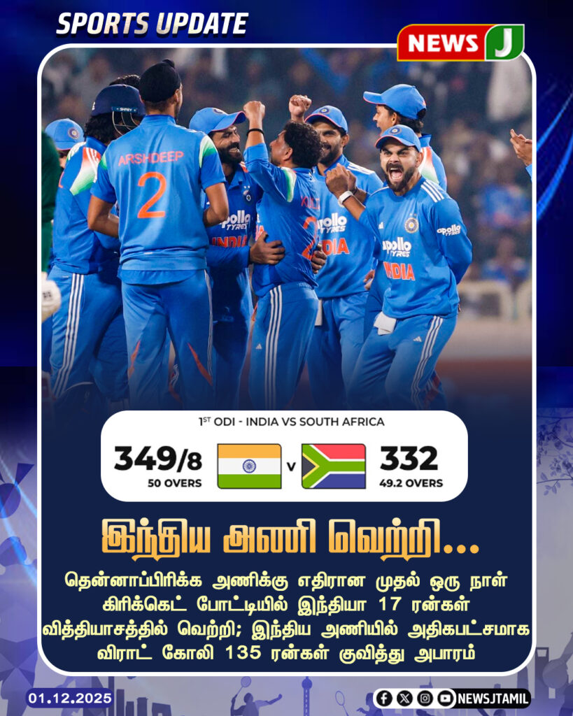India sealed a thrilling 17-run win in the first ODI against South Africa, defending a strong total of 349 runs. South Africa fell short, getting bowled out for 332 in 49.2 overs despite a spirited chase.