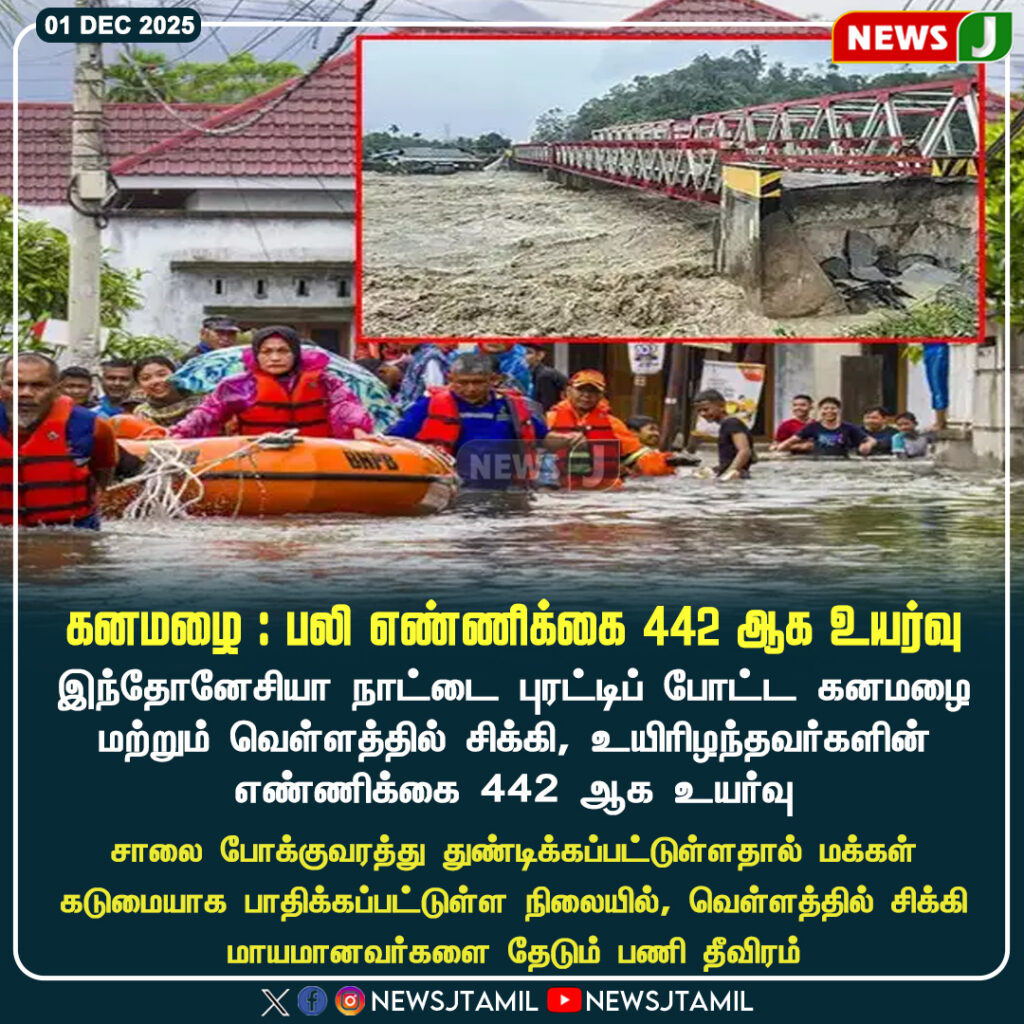 இந்தோனேசியாவில் தொடர்ச்சியான கனமழை மற்றும் வெள்ளப்பெருக்கு காரணமாக பலி எண்ணிக்கை தற்போது 442 ஆக உயர்ந்துள்ளது. நிலைமை மேலும் கவலைக்கிடம் உள்ளது.