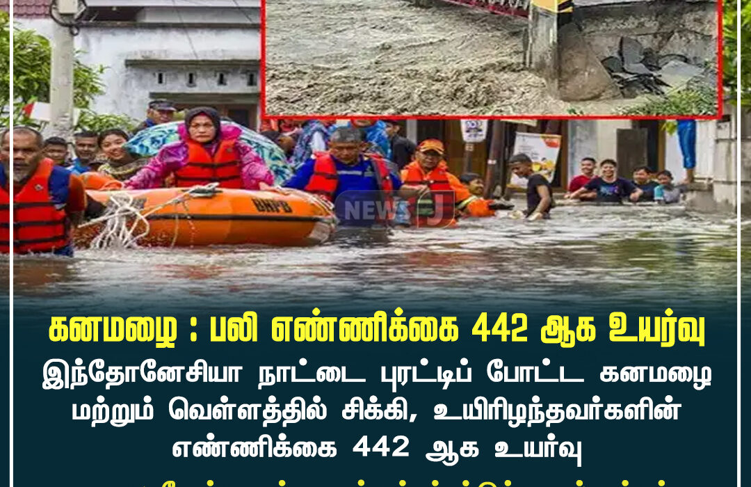 இந்தோனேசியா நாடு முழுவதும் பரவலாக பெய்த கனமழை, வெள்ளப்பெருக்கு மற்றும் நிலச்சரிவில் ஏற்பட்ட பேரழிவால் உயிரிழந்தவர்களின் எண்ணிக்கை 442 ஆக உயர்ந்துள்ளது.