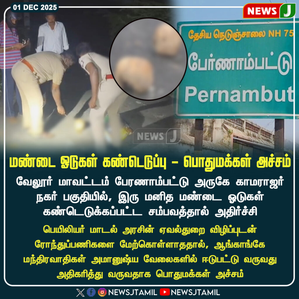 Two human skull fragments were recovered near the Pernambut area in Vellore district, causing shock among local residents. The remains were found along a roadside, prompting immediate police action.