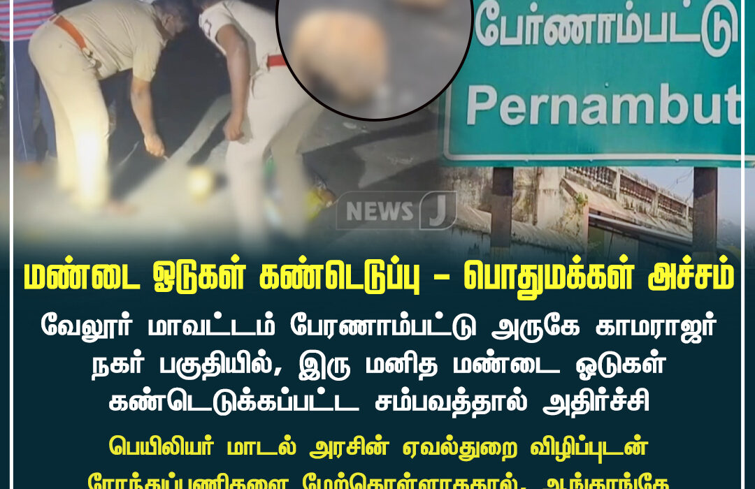 வேலூர் மாவட்டம் பேர்ணாம்பட்டு அருகே காராஜர் நகர் பகுதியிலுள்ள சாலையோரத்தில் இரு மனித மண்டை ஒடுகள் கிடந்தது கண்டெடுக்கப்பட்டதால் அச்சம் பரவியுள்ளது. இந்த சம்பவம் உள்ளூர் மக்களிடையே பரபரப்பை ஏற்படுத்தியுள்ளது.