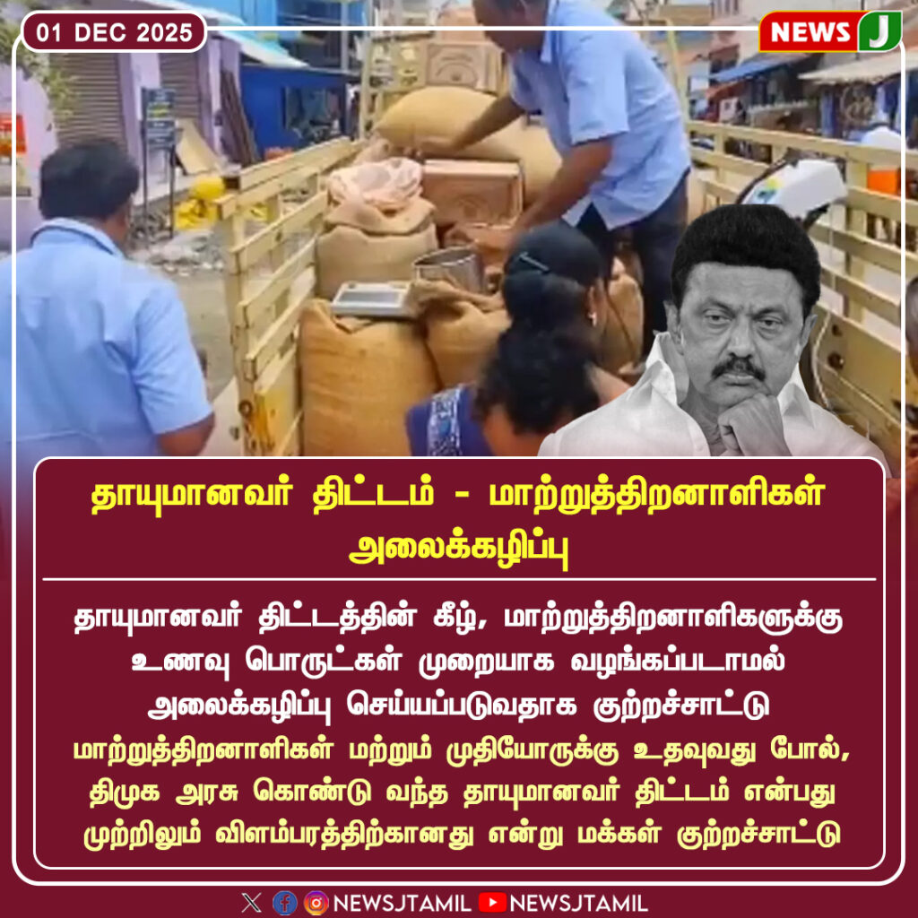 Residents in Tiruvarur and nearby areas allege that the benefits of the Dayumanuvar food scheme are not reaching many differently-abled people. Despite being officially listed, several beneficiaries claim they have not received the essential supplies.