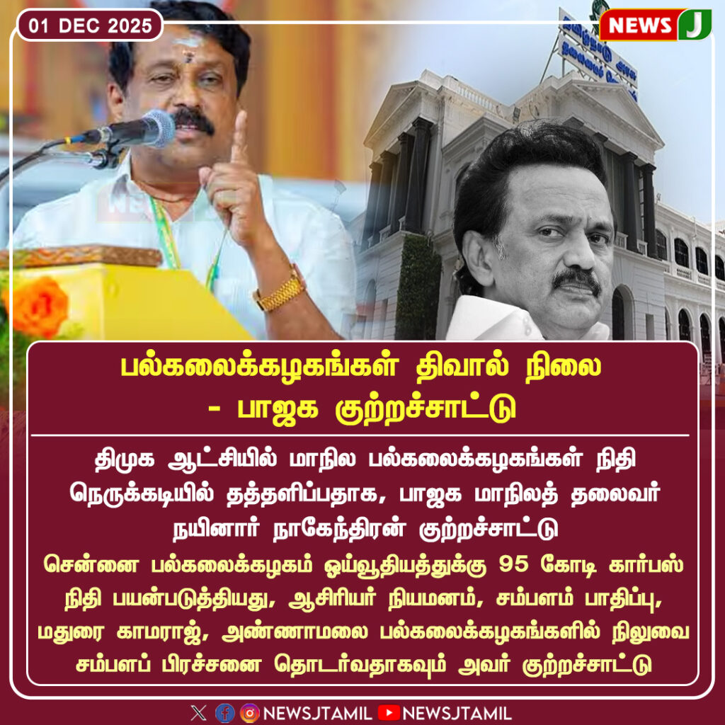 2025 டிசம்பர் 1 அன்று தமிழ்நாட்டில், மாநில அரசின் நிர்வாகக் குறைபாடுகள் காரணமாக பல்கலைக்கழகங்கள் கடும் நிதி நெருக்கடியில் உள்ளதாக பாஜக தலைவர்கள் குற்றம்சாட்டினர். பல்கலைக்கழகங்களின் அன்றாடச் செலவுகள், ஊழியர் சம்பளம் மற்றும் கல்வி மேம்பாட்டுத் திட்டங்கள் பாதிக்கப்பட்டுள்ளதாக தெரிவிக்கப்பட்டது.