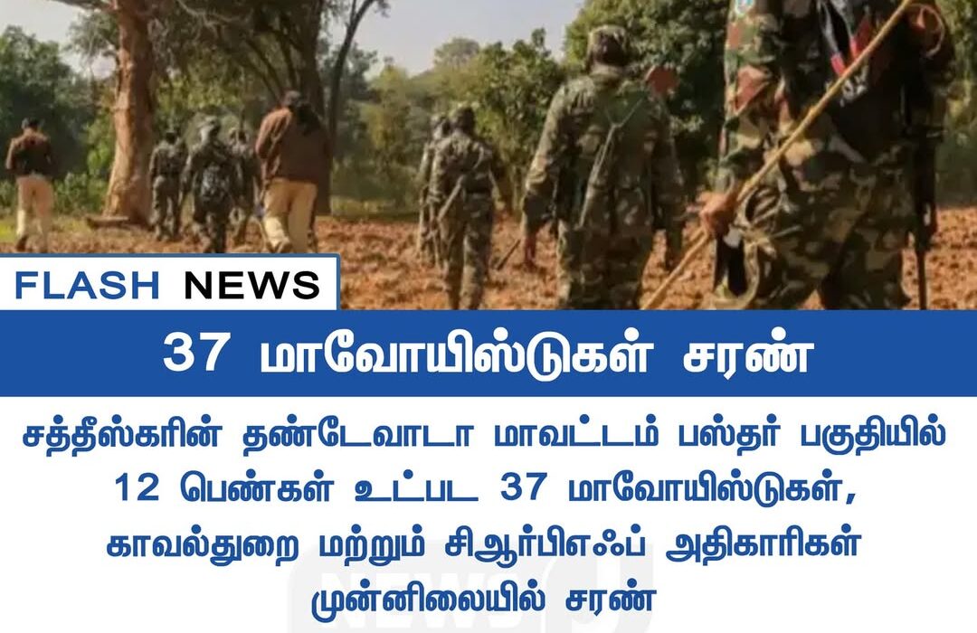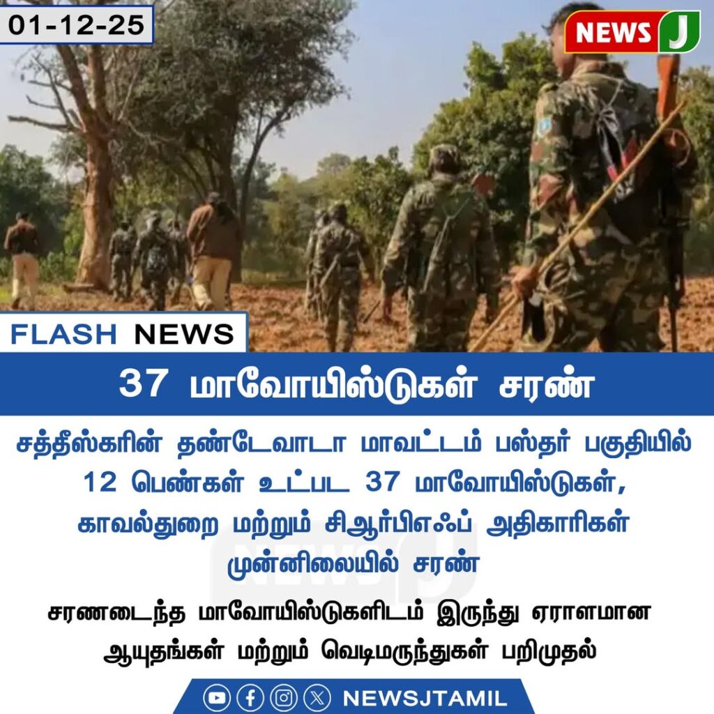 சத்தீஸ்கர் மாநிலத்தின் பஸ்தர் பகுதியில், 2025 டிசம்பர் 1 அன்று 12 பெண்கள் உட்பட மொத்தம் 37 மாவோயிஸ்டுகள் பாதுகாப்புப் படையினரிடம் சரணடைந்துள்ளனர். மாநில காவல்துறை மற்றும் மத்திய பாதுகாப்புப் படைகள் மேற்கொண்ட தொடர்ச்சியான தேடுதல் மற்றும் பாதுகாப்பு நடவடிக்கைகளின் விளைவாக இந்த சரணடைவு நிகழ்ந்ததாக அதிகாரிகள் தெரிவித்தனர்.