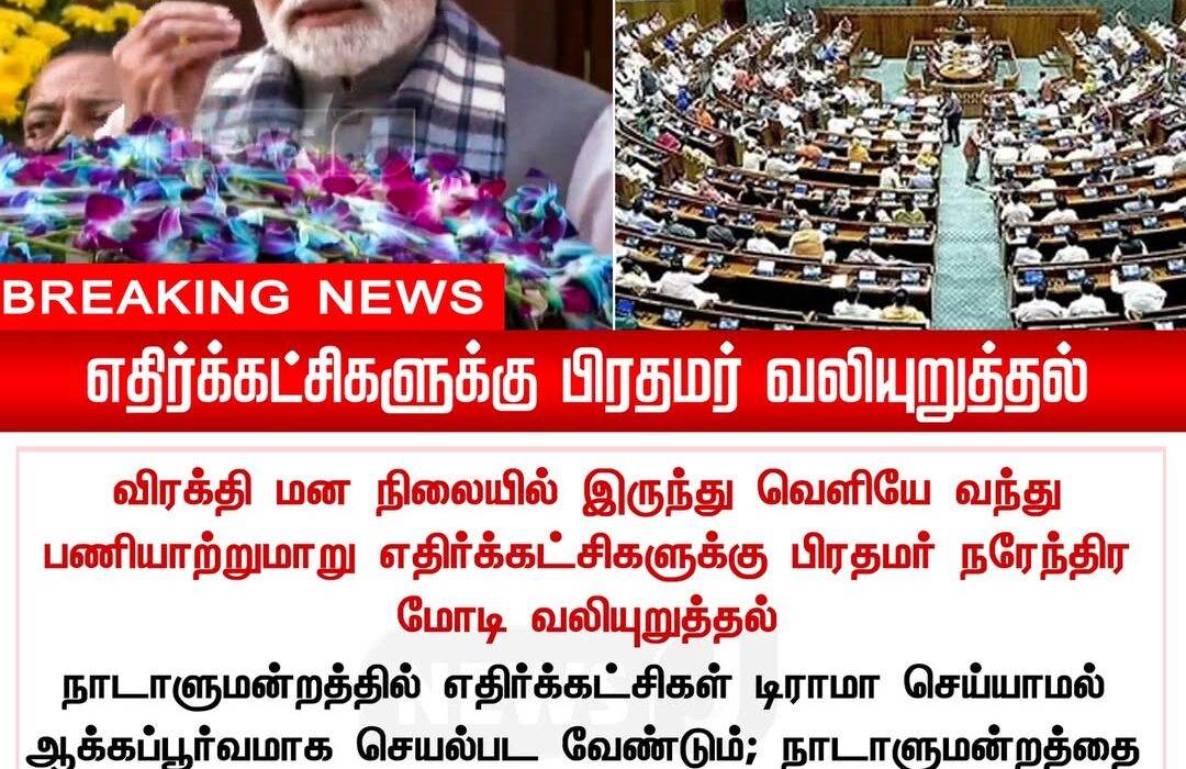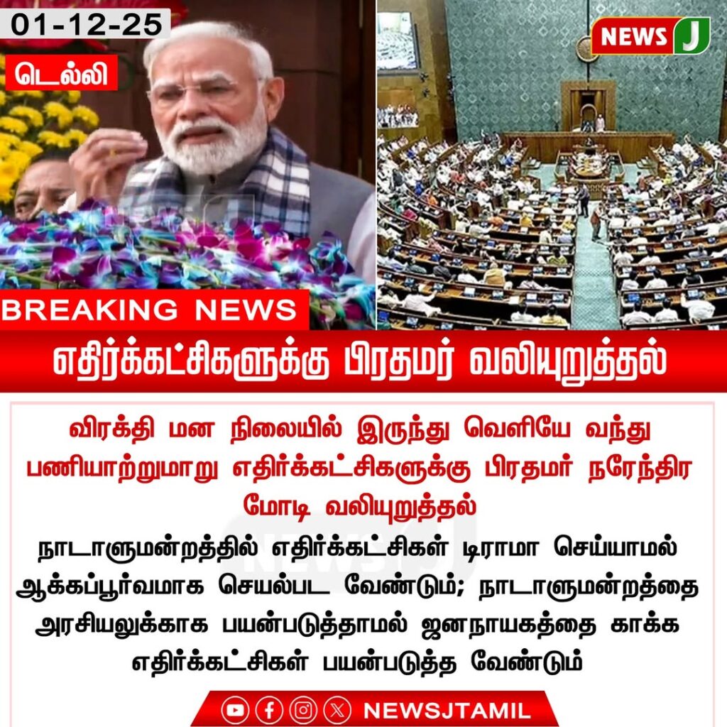டெல்லியில் 2025 டிசம்பர் 1 அன்று நடைபெற்ற நிகழ்வில், எதிர்க்கட்சிகளுக்கு பிரதமர் நரேந்திர மோடி முக்கிய விளியுறுத்தலை முன்வைத்தார். விருத்தி மழை நிலவிய சூழலில், எதிர்க்கட்சிகள் நாடாளுமன்ற நடவடிக்கைகளில் பொறுப்புடன் செயல்பட வேண்டும் என அவர் கேட்டுக்கொண்டார்.