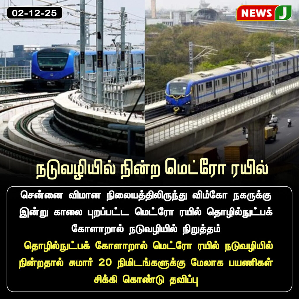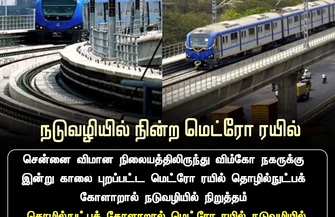 சென்னை விமான நிலையத்திலிருந்து விம்கோ நகர் நோக்கி இயக்கப்பட்ட மெட்ரோ ரயில், தொழில்நுட்பக் கோளாறு காரணமாக நடுவழியில் நிறுத்தப்பட்டது. இந்த சம்பவம் 2025 டிசம்பர் 2 அன்று காலை நேரத்தில் நிகழ்ந்ததாக தெரிவிக்கப்பட்டுள்ளது.