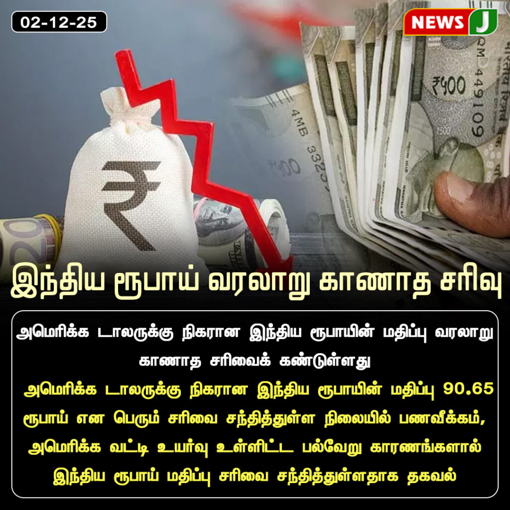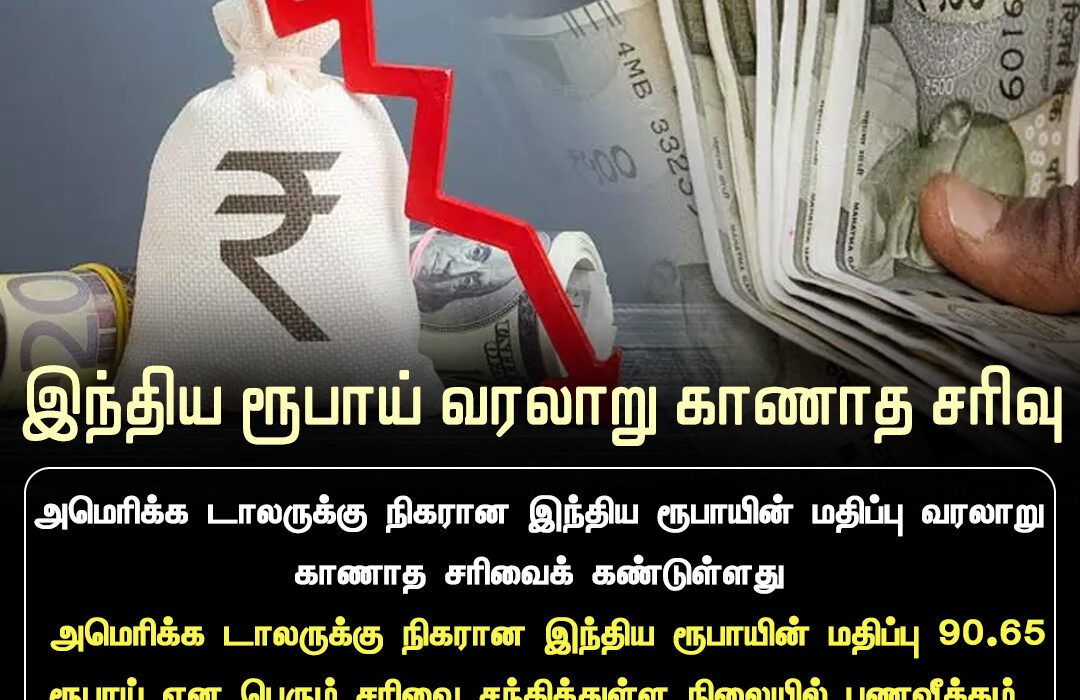அமெரிக்க டாலருக்கு எதிராக இந்திய ரூபாய் மதிப்பு 2025 டிசம்பர் 2 அன்று வரலாறு காணாத சரிவை சந்தித்துள்ளது. வர்த்தக நேரத்தில் ரூபாய் 90.65 என்ற அளவுக்கு வீழ்ச்சியடைந்ததாக நிதி சந்தை தரவுகள் தெரிவிக்கின்றன. இது சமீப ஆண்டுகளில் ரூபாயின் மிகக் குறைந்த மதிப்பாக பதிவாகியுள்ளது.