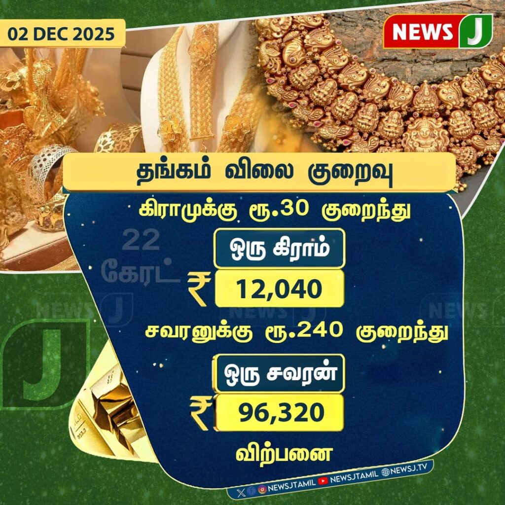 2025 டிசம்பர் 2 அன்று, இந்திய தங்க சந்தையில் தங்கம் விலை குறைந்துள்ளது. ஒரு கிராம் தங்கம் ரூ.30 குறைந்து ரூ.12,040 என்ற நிலையில் விற்பனை செய்யப்படுகிறது. இதனால் ஆபரண வாடிக்கையாளர்கள் மற்றும் முதலீட்டாளர்கள் கவனம் செலுத்தி வருகின்றனர்.