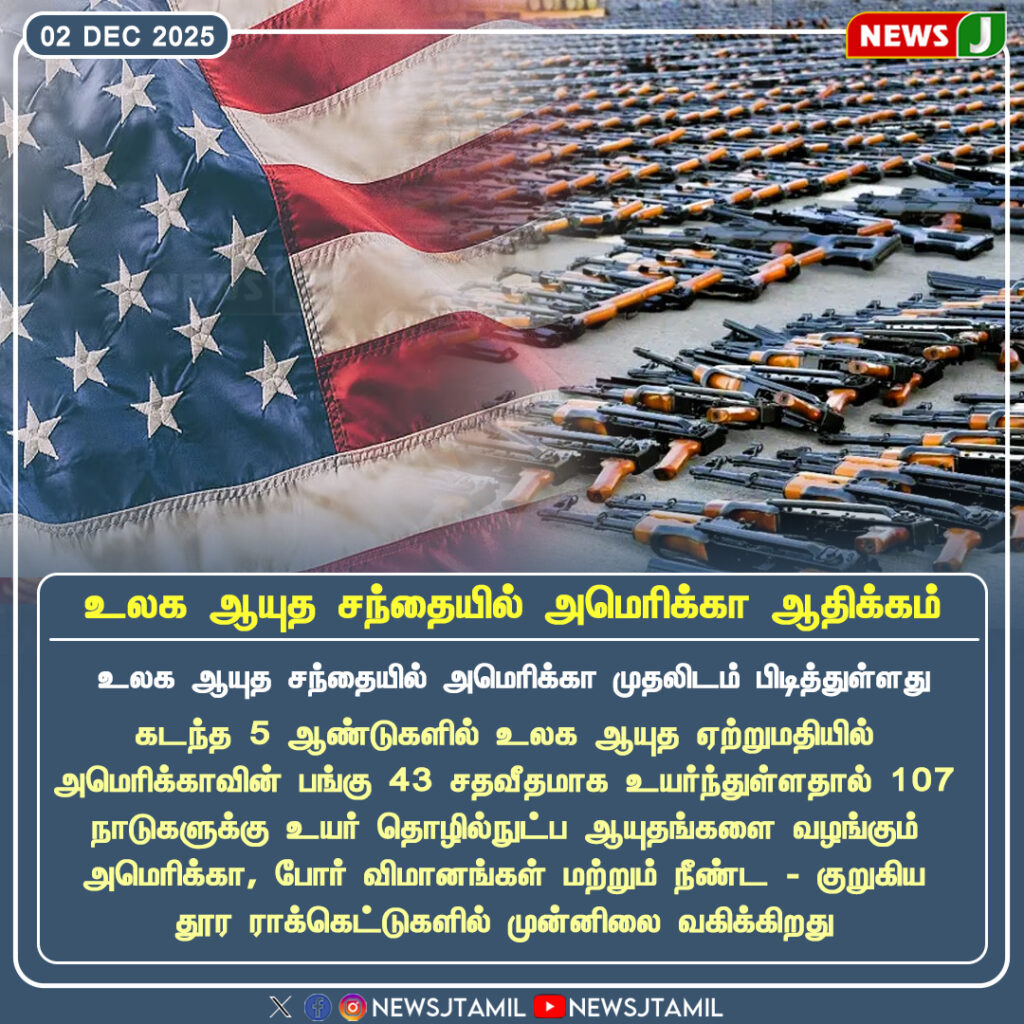 2025 டிசம்பர் 2 அன்று வெளியான தகவலின்படி, உலக ஆயுத சந்தையில் அமெரிக்கா முக்கிய ஆதிக்கம் செலுத்தி வருகிறது. கடந்த சில ஆண்டுகளில் அமெரிக்காவில் தயாரிக்கப்படும் ஆயுதங்கள் பல நாடுகளுக்கு ஏற்றுமதி செய்யப்பட்டு, உலக பாதுகாப்பு சந்தையில் அதன் பங்கை அதிகரித்துள்ளன.