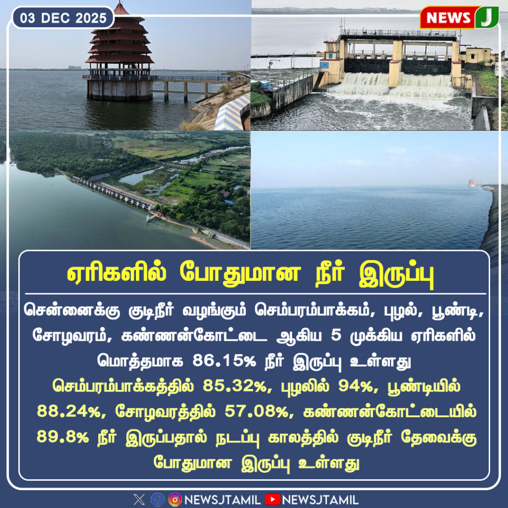 2025 டிசம்பர் 3 நிலவரப்படி, சென்னைக்கு குடிநீர் வழங்கும் செம்பரம்பாக்கம், புழல், பூண்டி, சோழவரம் மற்றும் கண்ணன்கோட்டை–ஆதியூர் ஆகிய ஐந்து முக்கிய ஏரிகளில் மொத்தமாக 86.15% நீர் இருப்பு பதிவாகியுள்ளது.