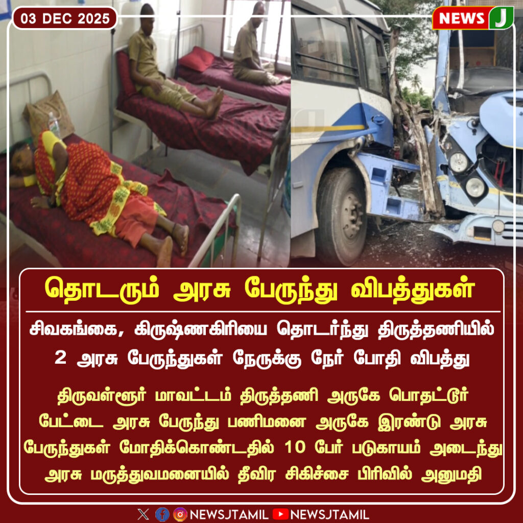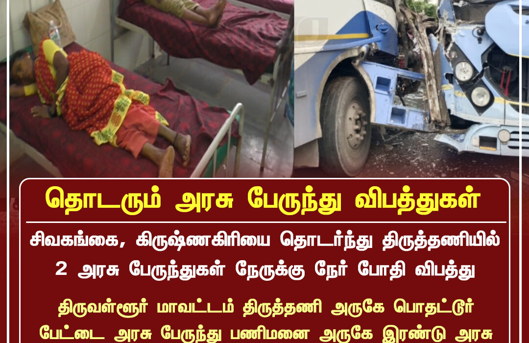 2025 டிசம்பர் 3 அன்று, சிவகங்கை மற்றும் திருத்தணி பகுதிகளில் அரசு பேருந்துகள் விபத்தில் சிக்கிய சம்பவங்கள் பெரும் பரபரப்பை ஏற்படுத்தின. இரண்டு தனித்தனி விபத்துகளில் பயணிகள் பலர் காயமடைந்து மருத்துவமனையில் சிகிச்சை பெற்று வருகின்றனர்.