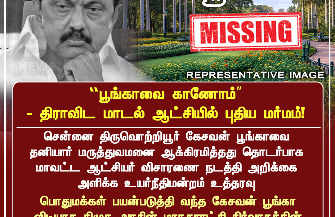 2025 டிசம்பர் 04 அன்று, சென்னை திருவொற்றியூரில் உள்ள கேசவன் பூங்கா திடீரென காணாமல் போனதாக குற்றச்சாட்டு எழுந்துள்ளது. பல ஆண்டுகளாக பொதுமக்கள் பயன்பாட்டில் இருந்த இந்த பூங்கா, எந்த முன் அறிவிப்பும் இன்றி அகற்றப்பட்டுள்ளதாக கூறப்படுகிறது.