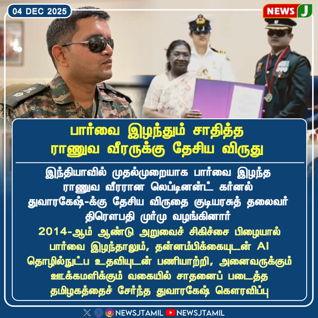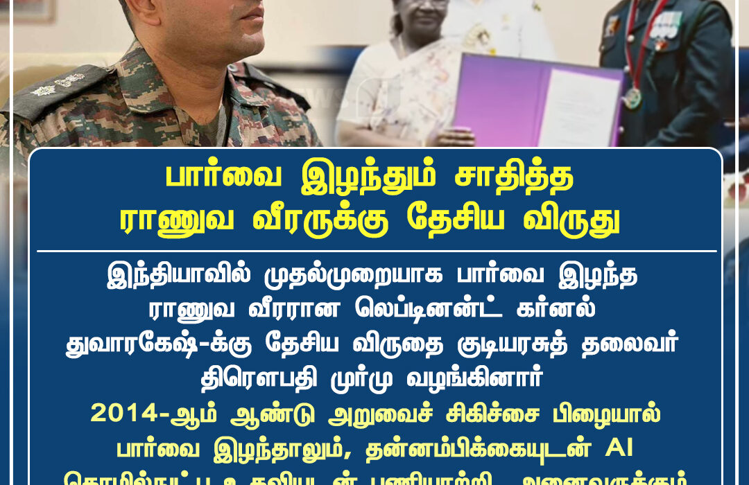 பார்வை இழந்தபோதும் நாட்டிற்கு சேவை செய்த ராணுவ வீரருக்கு தேசிய விருது வழங்கப்பட்டது | An Indian Army officer who lost his vision but continued to serve the nation has been honoured with a national award.