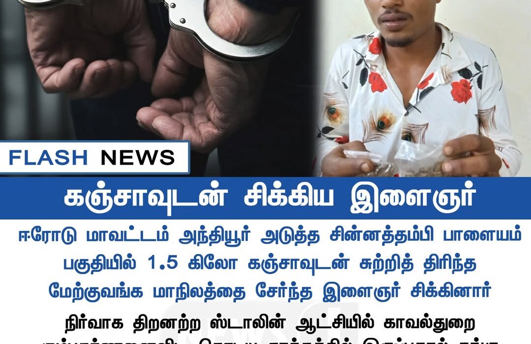 On December 4, 2025, police in the Anthiyur area near Chinnathambi Palayam in Erode district arrested a youth in connection with ganja trafficking. During a routine vehicle check based on suspicion, officers seized 1.5 kilograms of ganja from his possession.