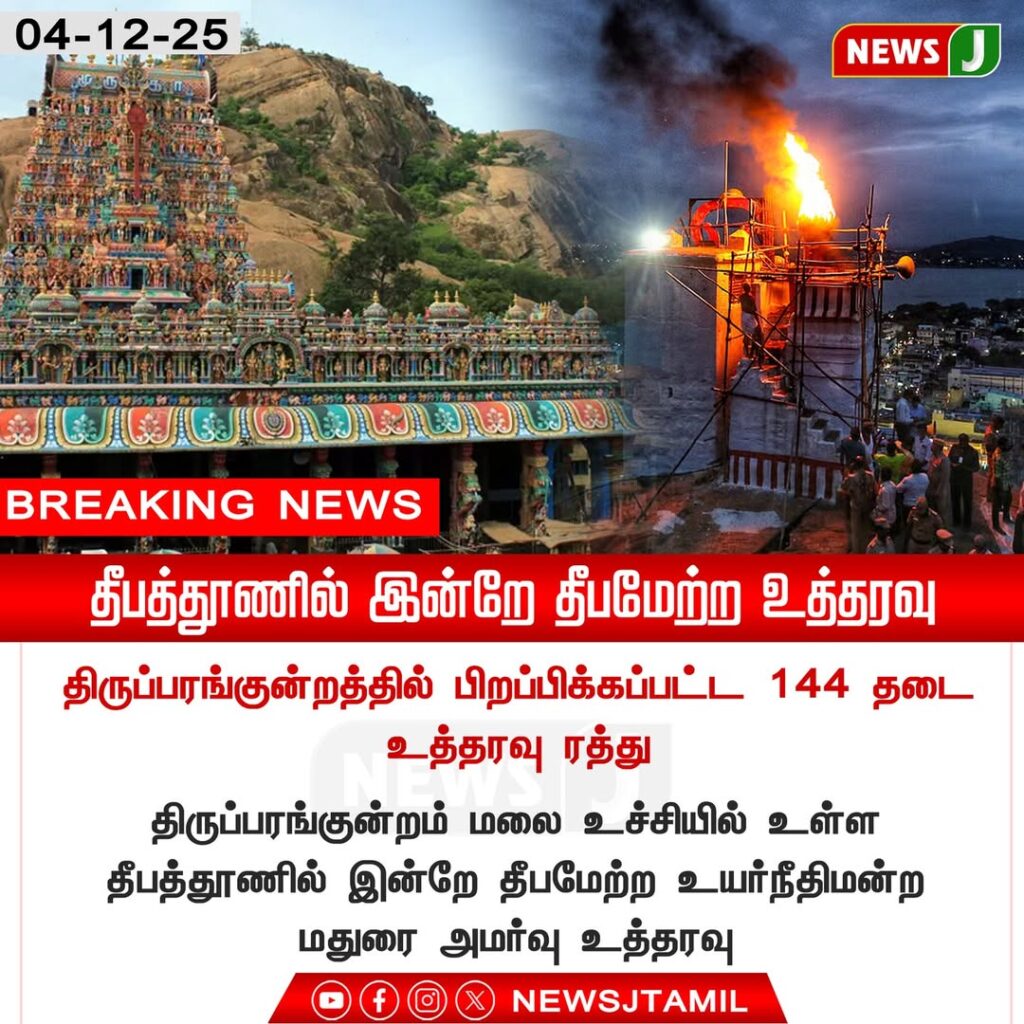 On December 4, 2025, Section 144 has been imposed in Thirupparankundram, Madurai district, ahead of the annual Deepam festival. As the ceremonial lighting of the Deepam is scheduled atop the hill tonight, restrictions have been enforced to prevent overcrowding and ensure public safety.