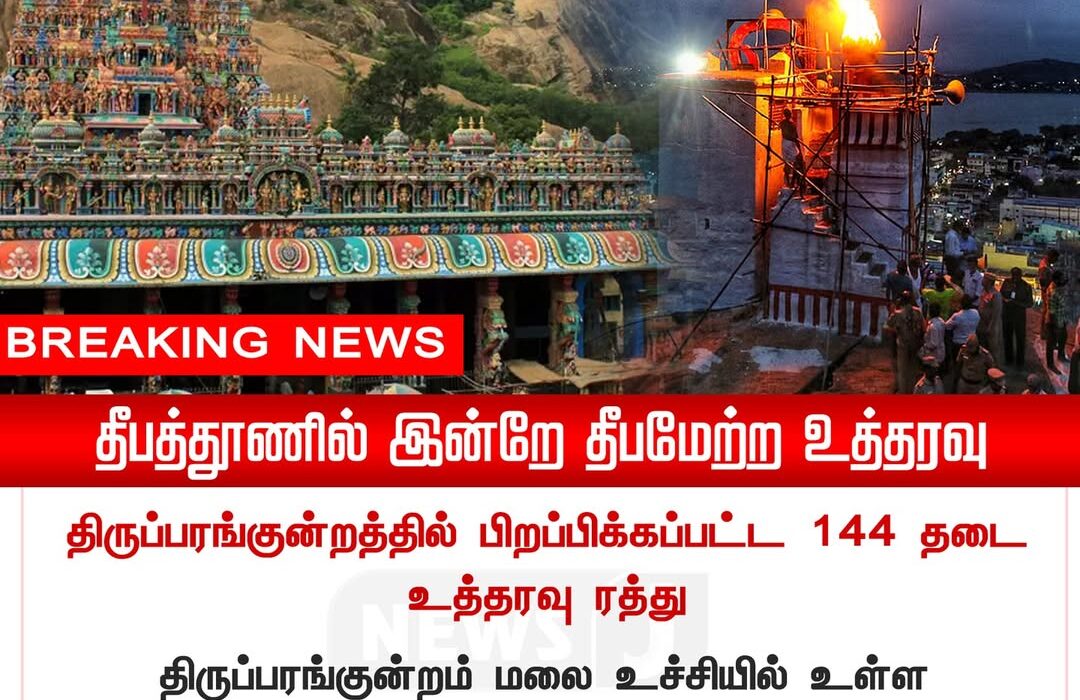 2025 டிசம்பர் 4 அன்று, மதுரை மாவட்டம் திருப்பரங்குன்றத்தில் நடைபெறும் வருடாந்திர தீபத் திருவிழாவை முன்னிட்டு 144 தடை உத்தரவு அமல்படுத்தப்பட்டுள்ளது. மலை உச்சியில் இன்றிரவு தீபம் ஏற்றப்பட உள்ள நிலையில், கூட்ட நெரிசல் மற்றும் பாதுகாப்பு காரணங்களுக்காக இந்த நடவடிக்கை எடுக்கப்பட்டுள்ளது.