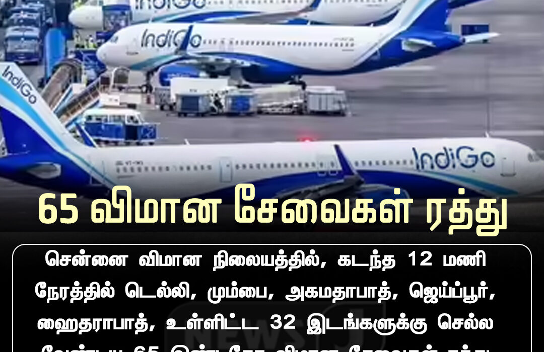 On December 5, 2025, as many as 65 flight services were cancelled at Chennai Airport. The cancellations include flights scheduled over the last 12 hours to destinations such as Delhi, Mumbai, Ahmedabad, Jaipur, Hyderabad, and a total of 32 locations.
