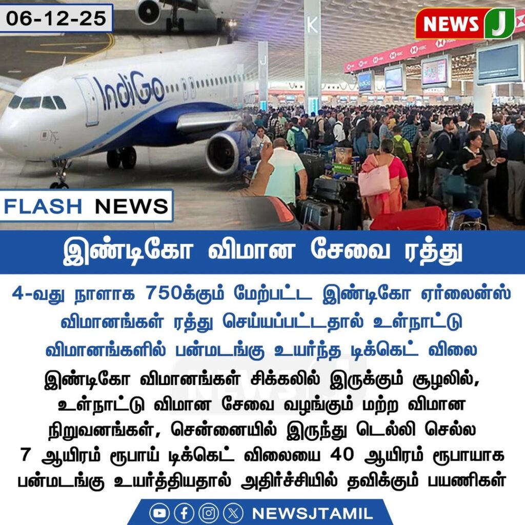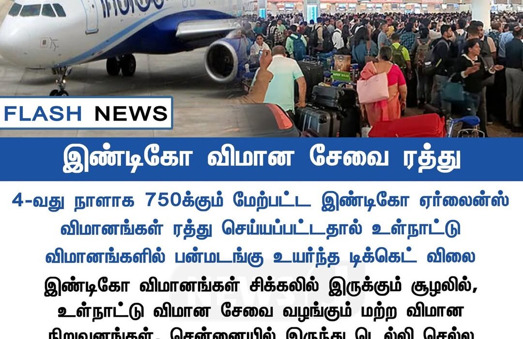 2025 டிசம்பர் 6 அன்று, இண்டிகோ ஏர்லைன்ஸ் விமானங்களில் தொழில்நுட்பக் கோளாறு காரணமாக பல விமான சேவைகள் ரத்து செய்யப்பட்டுள்ளன. கடந்த 4 நாட்களாக சுமார் 750க்கும் மேற்பட்ட இண்டிகோ விமானங்கள் ரத்து செய்யப்பட்டதாக தெரிவிக்கப்பட்டுள்ளது. இதனால் விமான நிலையங்களில் பயணிகள் பெரும் சிரமத்திற்கு உள்ளாகியுள்ளனர்.