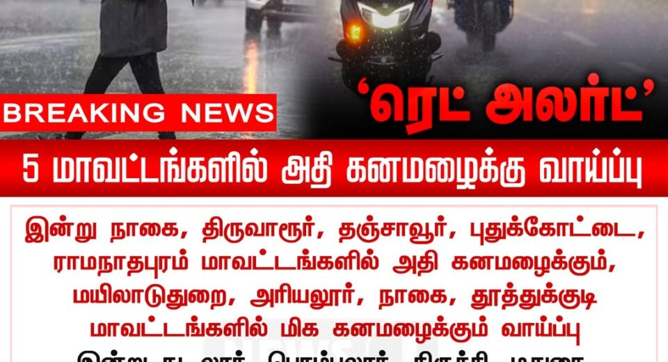 இன்று நாகை, திருவாரூர், தஞ்சாவூர், புதுக்கோட்டை, ராமநாதபுரம் மாவட்டங்களில் அதி கனமழைக்கான ‘ரெட் அலர்ட்’ | A red alert has been issued today for Nagapattinam, Tiruvarur, Thanjavur, Pudukkottai and Ramanathapuram due to expected very heavy rain