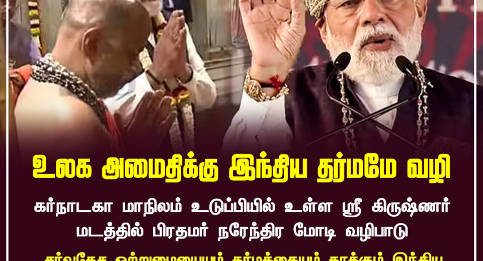 உடுப்பியில் நடைபெற்ற உரையின்போது பிரதமர் நரேந்திர மோடி, இந்திய தர்மத்தின் ஆன்மீக அடிப்படைகளே உலக அமைதிக்கான நிலையான தீர்வாக உள்ளன என வலியுறுத்தினார்.