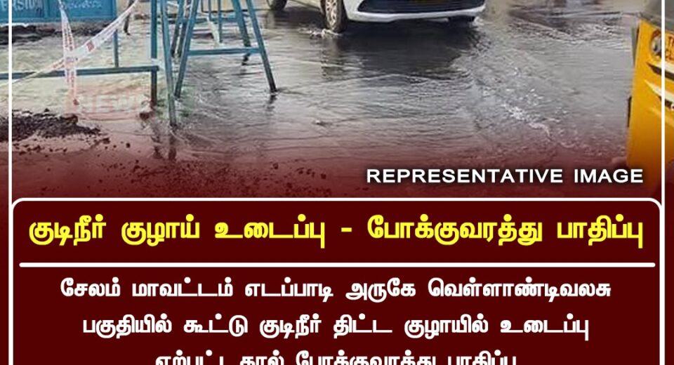 சேலம் அருகே குடிநீர் குழாய் பழுதால் சாலை நீர்மூழ்கியது. | Water pipeline burst near Salem disrupts traffic.