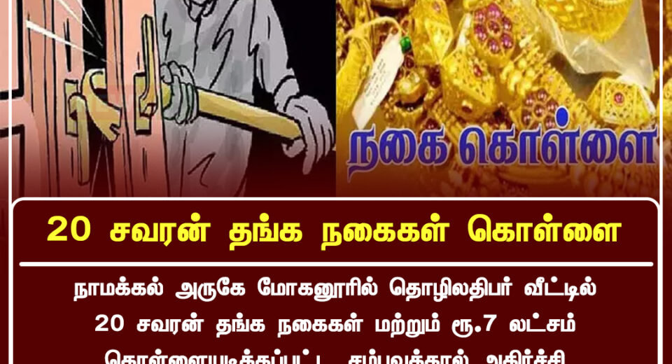 நாமக்கல் மோகவூரில் தொழிலதிபர் வீட்டில் 20 சவரன் நகைகள் கொள்ளை. | 20 sovereigns of gold stolen from a businessman’s house in Namakkal.