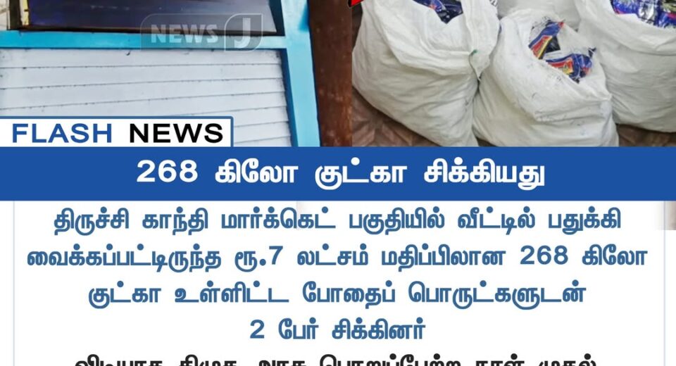 திறுச்சியில் வீட்டில் பதுக்கி வைத்திருந்த 268 கிலோ குட்கா பறிமுதல் | 268 kg of illegal gutka stored in a house seized by police