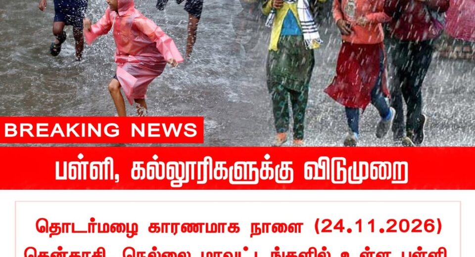 தொடர்மழை காரணமாக தென்காசி, நெல்லை மாவட்டங்களில் நாளை பள்ளி-கல்லூரிகளுக்கு விடுமுறை | Due to continuous heavy rains, holiday has been declared tomorrow for schools & colleges in Tenkasi and Nellai