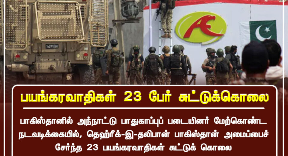 பாகிஸ்தானில் நடந்த பாதுகாப்புப் படைப் பணியில் 23 பயங்கரவாதிகள் சுட்டுக்கொல்லப்பட்டனர் | 23 terrorists killed during security forces’ operation in Pakistan