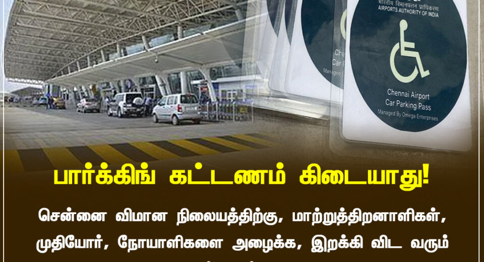 மாற்றுத்திறனாளிகள், முதியோர், நோயாளிகள் பயன்படுத்தும் வாகனங்களுக்கு இலவச அனுமதி | Free parking access for special-needs vehicles at Chennai Airport