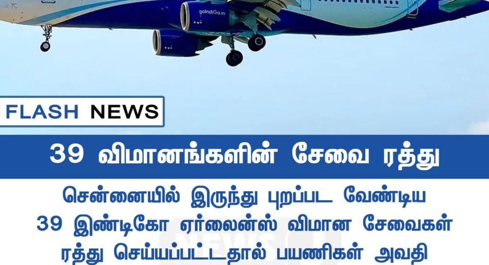 சென்னையில் இருந்து புறப்பட வேண்டிய 39 இண்டிகோ விமானங்களின் சேவை இன்று ரத்து செய்யப்பட்டுள்ளது | As many as 39 IndiGo flights scheduled to depart from Chennai have been cancelled today.