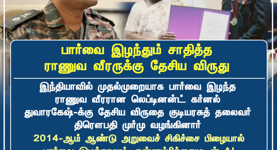 பார்வை இழந்தபோதும் நாட்டிற்கு சேவை செய்த ராணுவ வீரருக்கு தேசிய விருது வழங்கப்பட்டது | An Indian Army officer who lost his vision but continued to serve the nation has been honoured with a national award.