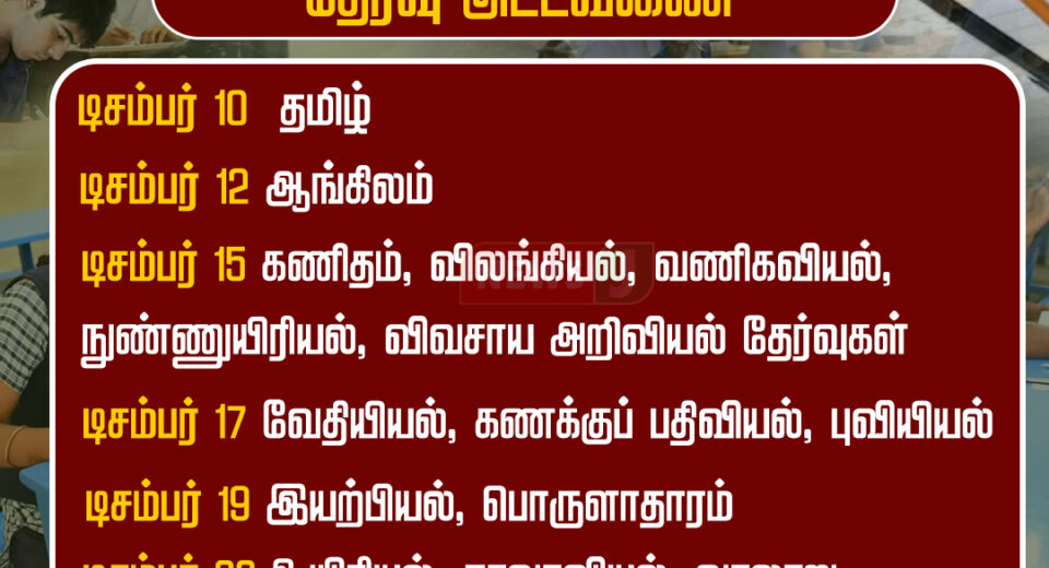 டிசம்பர் மாதம் நடைபெறும் 10ஆம் வகுப்பு அரையாண்டுத் தேர்வுகளுக்கான முழு தேதி அட்டவணை வெளியீடு | Full December Exam Timetable for Class 10 Released