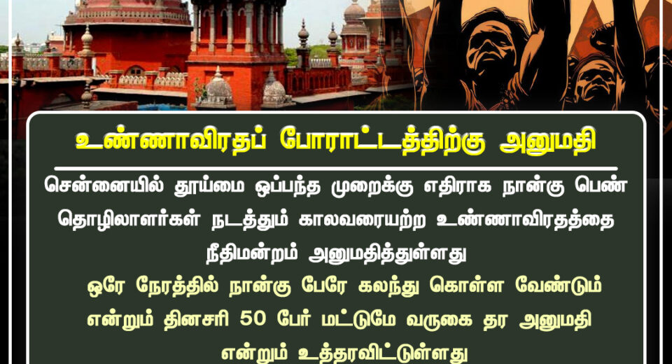 சென்னையில் பெண்தொழிலாளர்களின் உண்ணாவிரதப் போராட்டத்திற்கு நீதிமன்றம் அனுமதி வழங்கியது | Court Allows Hunger Strike by Women Workers in Chennai