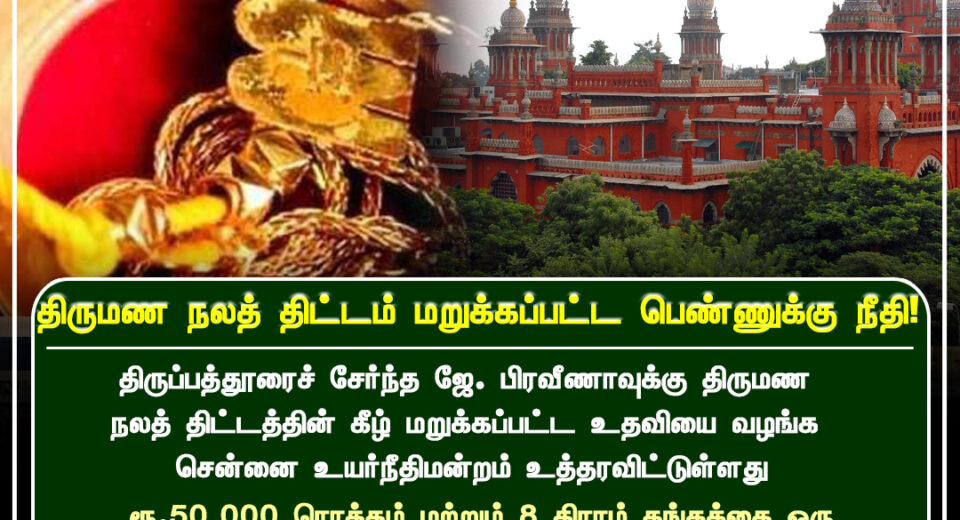 மறுக்கப்பட்ட திருமண நலத் திட்ட உதவிக்காக நீதிமன்றம் உத்தரவு | ரூ.50,000 நிவாரணமும் 8 கிராம் தங்கமும் வழங்க உத்தரவு.