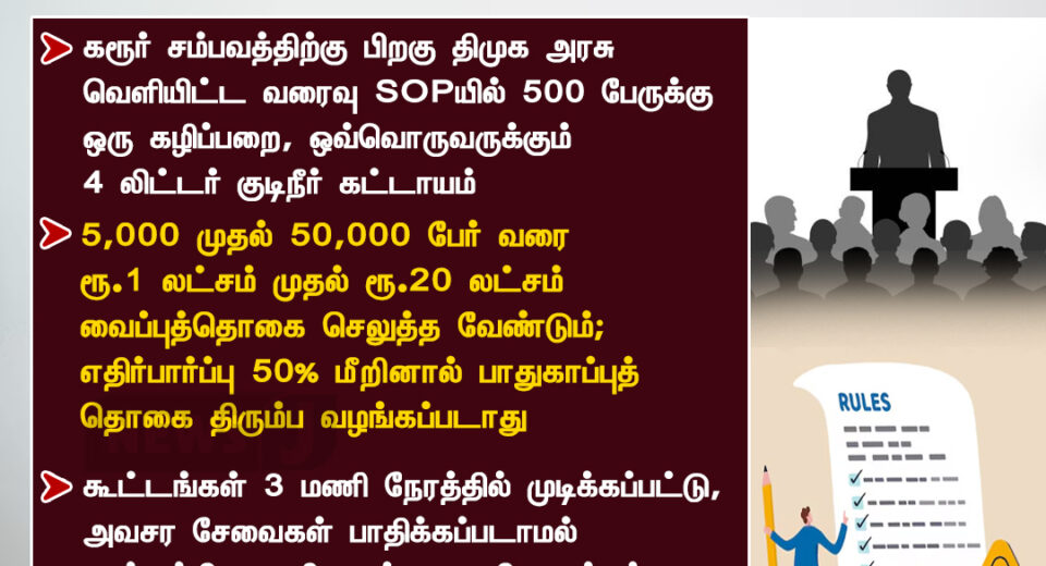 திமுக அரசின் புதிய வழிகாட்டுதல்கள் வெளியீடு | Tamil Nadu government issues revised SOPs for political and public meetings.