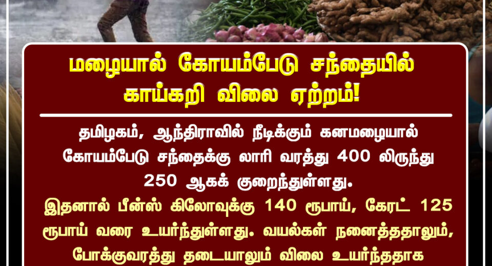கோயம்பேடு சந்தையில் பீர்க்காய், பீன்ஸ், கேரட் உள்ளிட்ட காய்கறிகள் விலை உயர்வு | Prices of beans, carrots, and gourds surge due to rain-hit supplies.