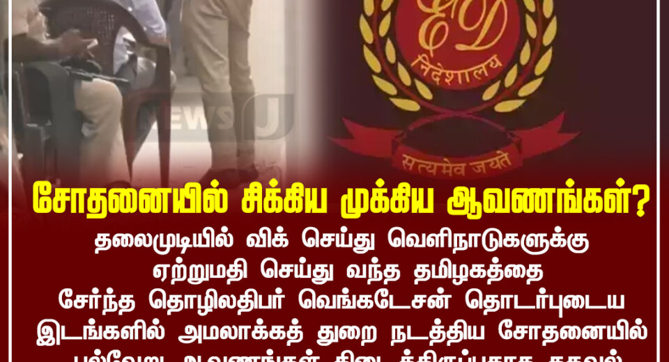 சென்னையில் நடைபெற்ற அமலாக்கத்துறை சோதனையில் பல முக்கிய ஆவணங்கள் பறிமுதல் செய்யப்பட்டன | Several key documents have been seized during an Enforcement Directorate raid in Chennai.