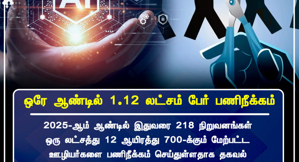 2025 ஆம் ஆண்டில் இதுவரை 218 நிறுவனங்கள், உலகளவில் 1.12 லட்சம் ஊழியர்களை பணிநீக்கம் செய்துள்ளன என அறிக்கை வெளியாகியுள்ளது. | So far in 2025, around 218 companies have laid off over 1.12 lakh employees across the globe, according to a recent report.