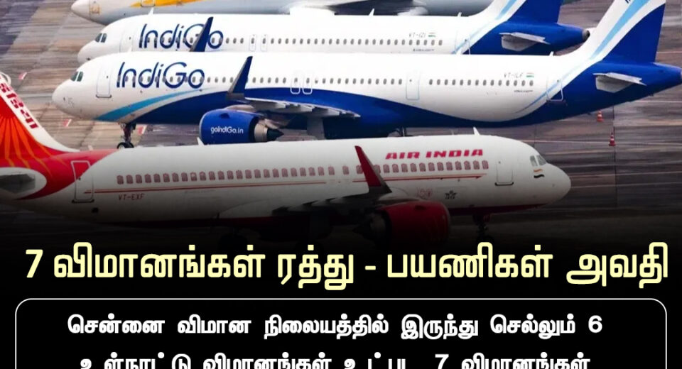 சென்னை விமான நிலையத்தில் தொழில்நுட்ப மற்றும் செயல்பாட்டு காரணங்களால் 7 விமானங்கள் ரத்து செய்யப்பட்டதால் பயணிகள் பாதிப்பு | At Chennai airport, seven flights were cancelled due to technical and operational reasons, causing inconvenience to passengers